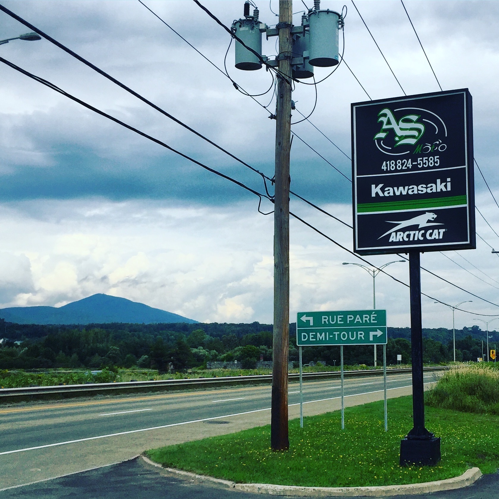 Je me répète un brin plus fort « FOCUS LE GROS! » en passant sur le lieux de l’accident mortel tout récent, à la hauteur de la Petite-Rivière-Saint-François, en pensant, un peu plus fort à Pascal. Je me rapproche de la ville, bientôt je quitterai la ligne droite de la 138 pour traverser Québec, j’ai besoin de faire réparer mes clignotants, arrêt chez AS Moto Kawasaki de Château-Richer, où la vieille KLR se fait rafistoler pendant que je relaxe avec le mont Sainte-Anne bien en vue.