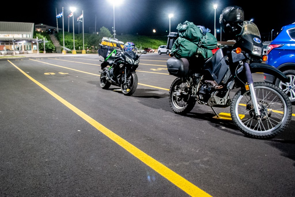 J’espérais arriver à Souris au coucher de soleil, je veux éviter à tout prix de rouler à la noirceur fatigué d’une longue journée. Mais j’ai pris du retard et je pointe à l’est du continent un peu plus tard que j’aurais voulu. Avant d’atteindre le pont de la confédération, je suis surpris en pleine courbe de manquer d’essence! En fait j’ai épuisé mon essence sauf pour mes 5 litres de réserve. La forme du réservoir d’essence de la KLR fait que quand il reste environ 5 litres on doit tourner une valve manuellement pour permettre de bien vider le fond du réservoir, ce que je fais pour redémarrer vers une station d’essence. Je suis quand même surpris. Lors du voyage au Labrador nous avions une portion de 426 km dans le bois sans aucun service, nous faisions donc attention à notre consommation, et nous avions un bidon d’essence dans nos bagages pour être certain de nous rendre à la civilisation, À cette époque j’avais roulé presque 400 km avant d’ouvrir ma réserve. Mais rappelons nous qu’à l’époque j’avais un carburateur mal en point qui limitait ma vitesse, et en plus on roulait sur des chemins de gravier en pleine forêt, on allait donc moins vite que sur cette belle grosse autoroute de NB! Bref, j’ai brûlé mon gaz en 263 km aujourd’hui, j’allais peut-être un peu plus vite que je pensais, hehum… je dois ici avouer que l’indicateur de vitesse de ma moto a lâché juste avant que je parte de Montréal. Oui, bon, j’ai peut-être roulé un peu plus vite que je pensais, en toute Mantra-Concentration-Sécurité, bien entendu.