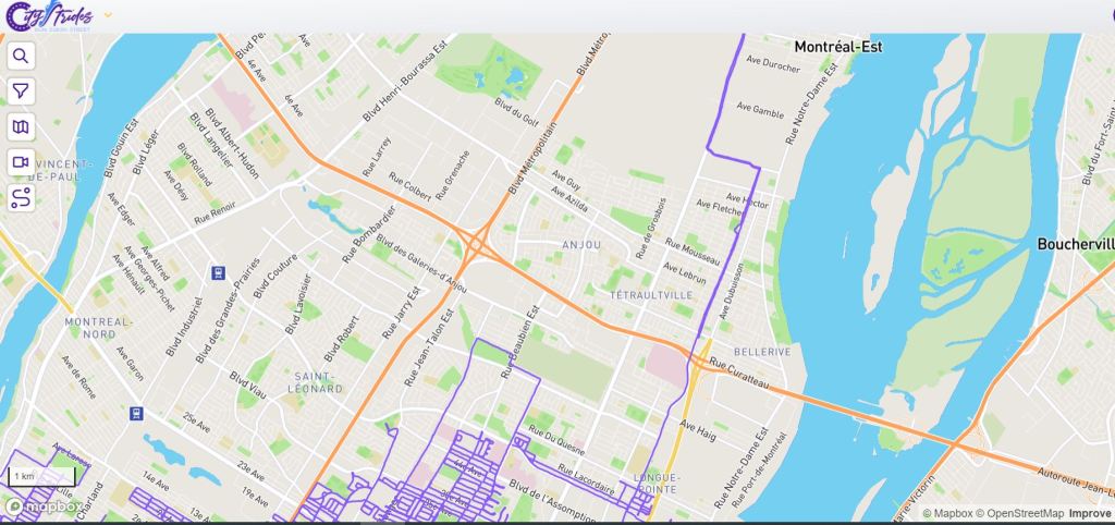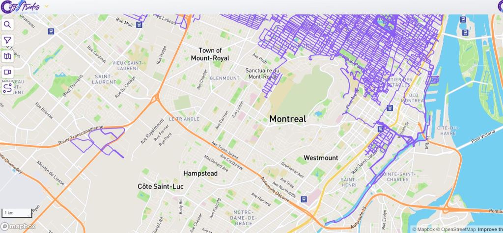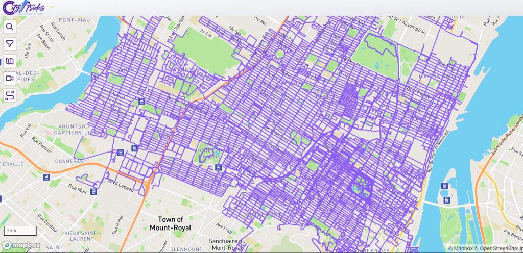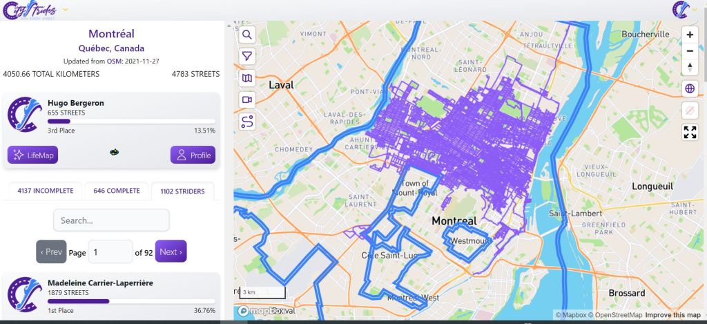 À mesure que je remplissais ma carte, je découvrais quelques adeptes d’un peu partout dans le monde, et j’adore suivre leurs expériences (coucou Louikini!) Au début, pour compiler mes trajets j’utilisais un outil web mis en ligne par un développeur. indépendant, le Strava Multiple Ride Mapper. L’outil fonctionne très bien, mais je suis passé depuis à CityStrides. En plus d’une interface plus développée, on y trouve une grosse communauté de coureurs. Je peux voir sur CityStrides, en ce 17 décembre 2021, que sur 1102 coureurs montréalais je suis en 3ème position avec 13,51% des rues de la ville complétée. Sur la droite de l’image vous voyez les rues couvertes, en mauve. Pas si mal!